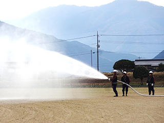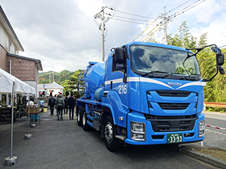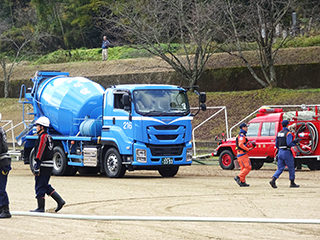 当日は、 住民や消防、警察、自衛隊など関係機関約400人が連携して非常時の対応を確認しました。 当組合からは、会場直近の岡北生コン加茂工場と鏡野エ場の生コン車が出動し、消防が放水訓練を行うための水を運搬し、訓練に協力しました。