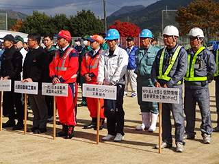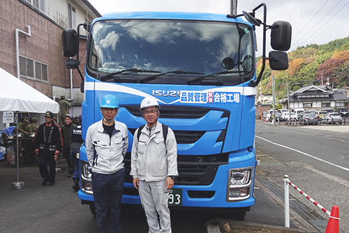 当日は、 住民や消防、警察、自衛隊など関係機関約400人が連携して非常時の対応を確認しました。 当組合からは、会場直近の岡北生コン加茂工場と鏡野エ場の生コン車が出動し、消防が放水訓練を行うための水を運搬し、訓練に協力しました。